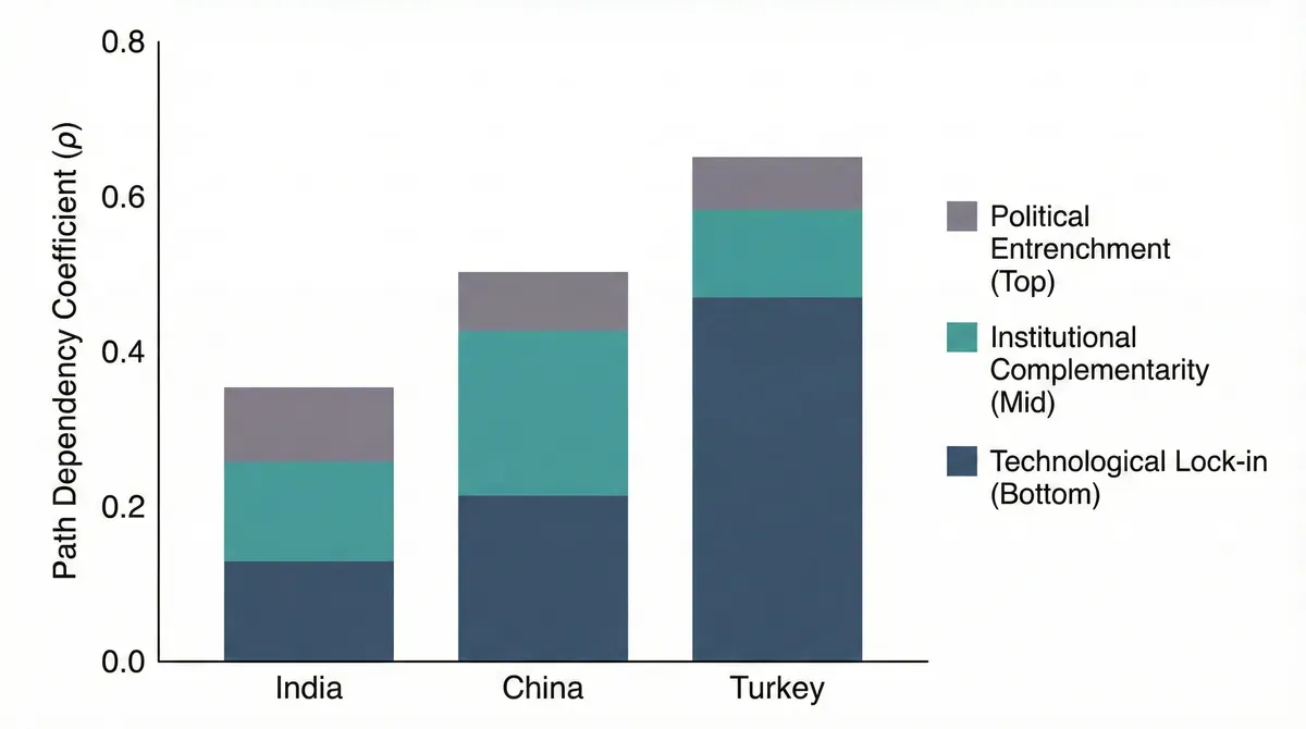 Building on these theoretical foundations, we conceptualize the path dependency coefficient ρ as a composite assessment ranging from 0 (fully flexible) to 1 (completely locked). The coefficient captures the aggregate rigidity arising from technological, institutional, and political lock-in mechanisms operating simultaneously.