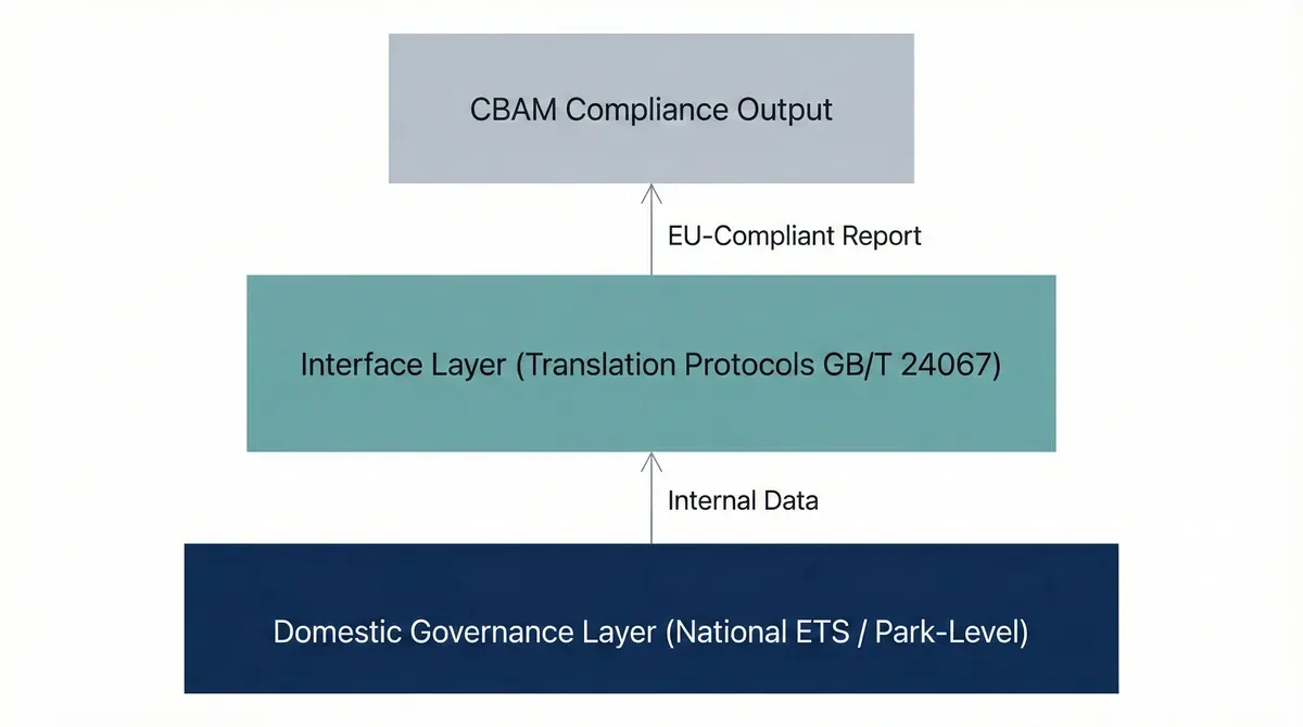 The foundation layer preserves existing carbon governance arrangements. National ETS continues operating with enterprise-level allocation and compliance. Provincial carbon markets maintain their established frameworks. Industrial park management retains carbon accounting at cluster levels. These arrangements serve ongoing domestic policy objectives including emissions intensity targets under five-year plans, regional competitiveness management, and state-owned enterprise performance evaluation. CBAM compliance requirements do not penetrate this layer, which remains insulated from external regulatory influence.
