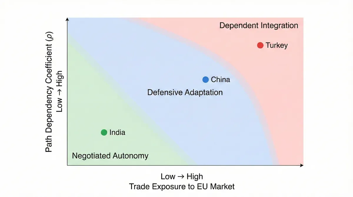 High trade exposure combined with high path dependency creates the most constrained position, essentially forcing dependent integration. Turkey exemplifies this configuration. With 41% export dependence on EU markets and ρ≈0.65 constraining transformation speed, Turkey lacks viable alternatives to regulatory alignment. Resistance would sacrifice market access that cannot be readily replaced. Defensive adaptation through parallel systems requires institutional flexibility that comprehensive alignment consumes. The structural position leaves dependent integration as the only sustainable path.