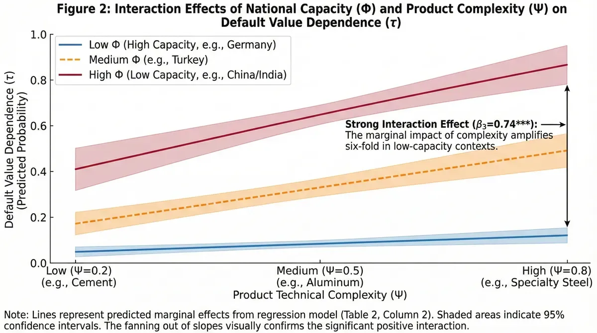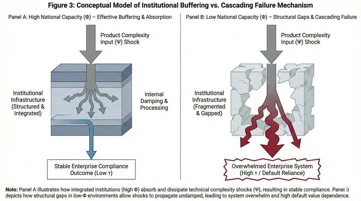 The contrast illuminates the interaction mechanism. In high-capacity countries, institutions create absorptive buffers. Difficulties arise, but systems contain them. Each Ψ increment adds manageable cost. In low-capacity countries, institutions provide no cushioning. Simple products barely function. Complex products push enterprises over cliffs. The marginal cost of Ψ skyrockets because no institutional safety net exists. This conditional relationship—where Ψ's impact depends on Φ level—generates the positive interaction coefficient our regression detects.