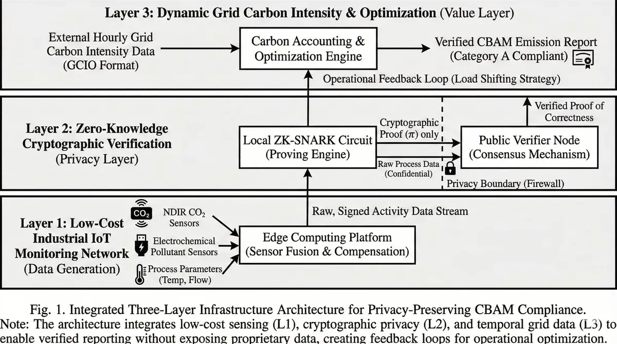 This research presents a three-layer technical framework addressing these interconnected challenges through synergistic integration rather than isolated solutions. Layer 1 establishes low-cost sensor networks employing industrial IoT components and edge computing platforms, achieving regulatory-acceptable data quality through computational compensation rather than physical precision. Layer 2 implements zero-knowledge cryptographic protocols enabling mathematical verification of calculation correctness without exposing underlying process data, resolving the privacy-verification paradox. Layer 3 develops dynamic grid carbon intensity mapping with temporal resolution appropriate to sector-specific operational patterns, enabling load optimization strategies that multiply the economic returns from monitoring infrastructure.