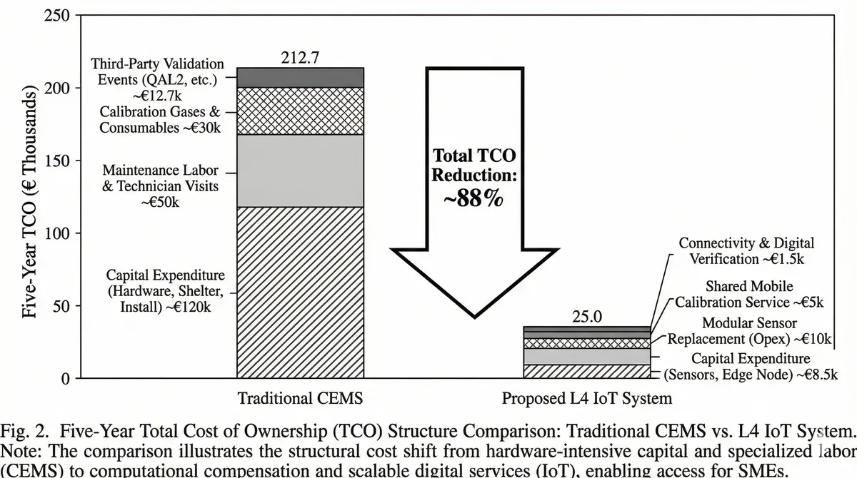 Five-year total cost of ownership analysis demonstrates the cost structure transformation this architecture enables. Traditional CEMS accumulates €210,000 TCO (€120,000 capital expenditure plus €18,000 annual operating expenditure over five years at 3% inflation). The L4 IoT system reaches €25,000 TCO (€8,500 capital plus €3,500 annual operating expenditure), representing 88% cost reduction under baseline assumptions. Annual operational savings comprise reduced labor through modular sensor replacement versus certified technician site visits, lower calibration gas consumption via shared mobile units, and eliminated third-party verification fees under digital monitoring-reporting-verification protocols [26].