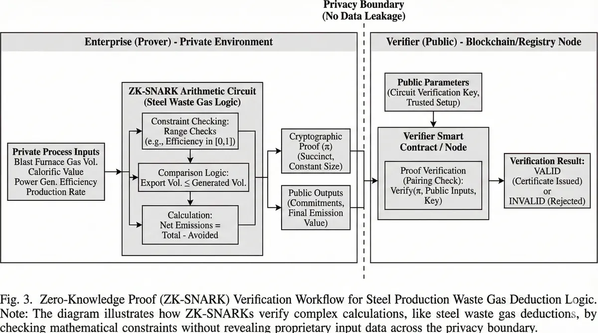Zero-knowledge cryptographic protocols offer mathematical resolution to this seemingly intractable paradox. The technology enables a prover to convince a verifier that a computation was performed correctly without revealing the inputs to that computation. Applied to carbon accounting, an enterprise can demonstrate "my embedded emissions equal X tons CO₂, calculated according to CBAM methodology" without exposing fuel consumption, emission factors, or process parameters underlying the calculation. Verification occurs through mathematical constraint satisfaction rather than data inspection, preserving regulatory confidence while protecting commercial confidentiality [31].