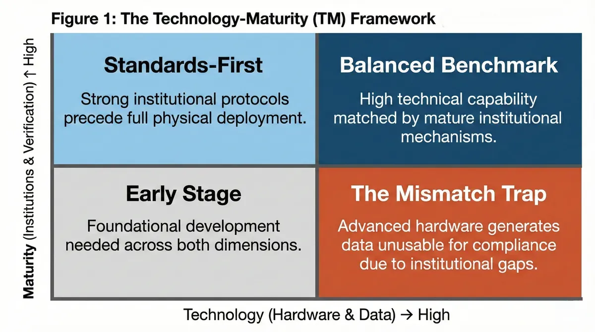 These dimensions can develop independently. A country might import monitoring equipment rapidly, achieving high Technology scores within years, while Maturity accumulates gradually through regulatory refinement and verifier experience building. Conversely, a country might adopt international standards and train verification professionals before deploying physical monitoring infrastructure, producing high Maturity with lower Technology. The resulting T-M combinations generate distinct system characteristics.
