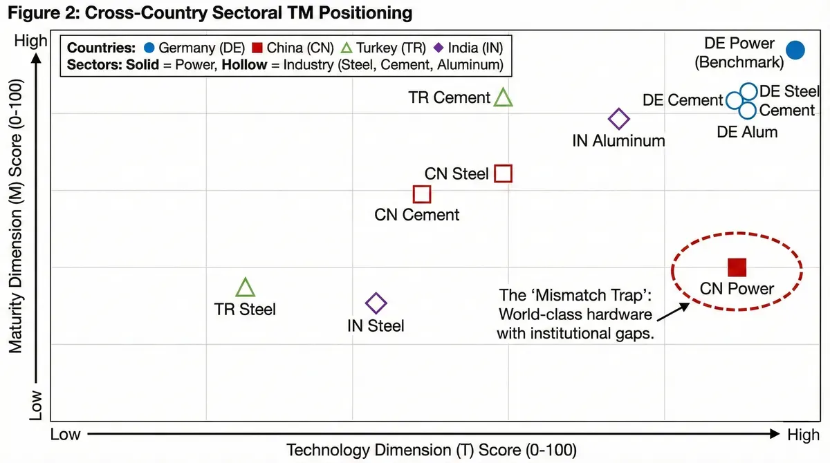 China's power sector presents the framework's most instructive case, demonstrating that Technology and Maturity can diverge substantially even within a single country and sector. The sector achieves high T scores, approaching Germany's benchmark, yet faces constrained M due to institutional arrangements misaligned with CBAM requirements.