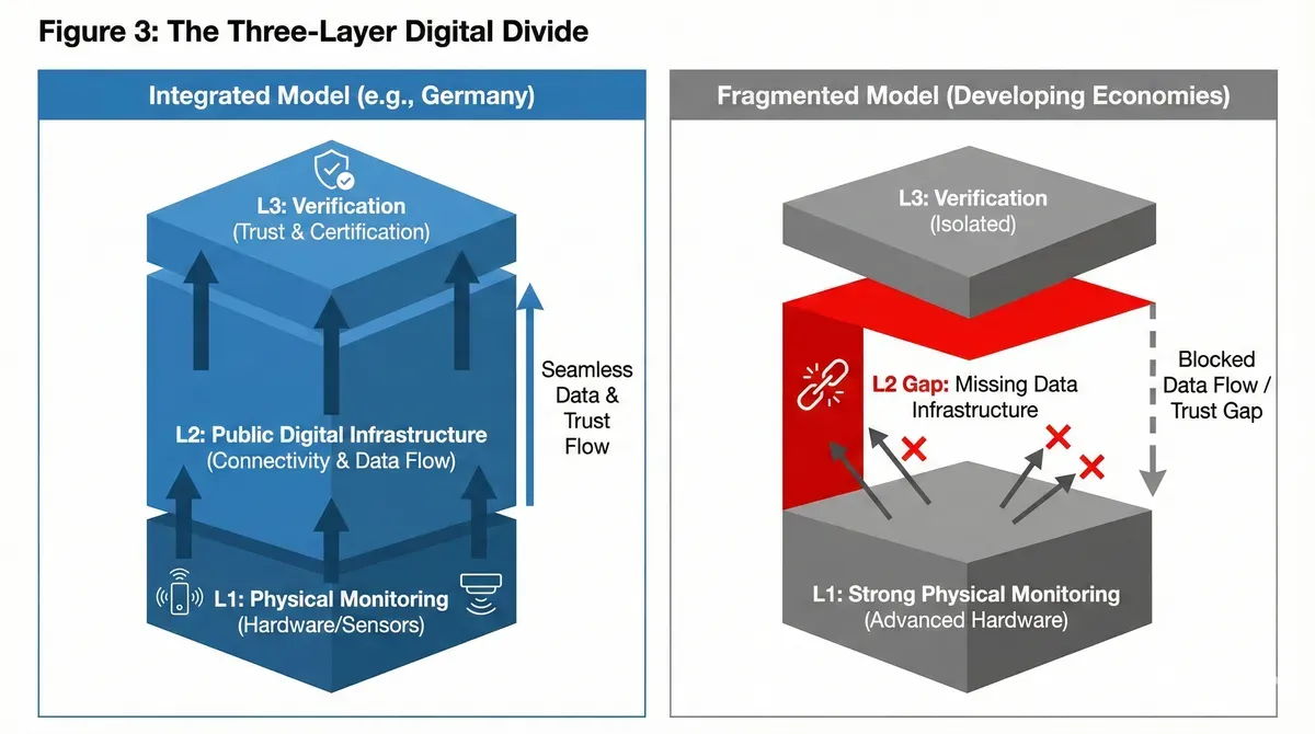 The three-layer digital architecture model further refines diagnosis. Layer 1 (physical monitoring) develops most rapidly through capital investment. Layer 2 (data transmission) benefits from public infrastructure provision that private markets may underprovide. Layer 3 (verification) requires sustained experience accumulation that cannot be accelerated beyond certain limits. Understanding which layers constrain particular systems enables targeted rather than diffuse capacity-building investments.