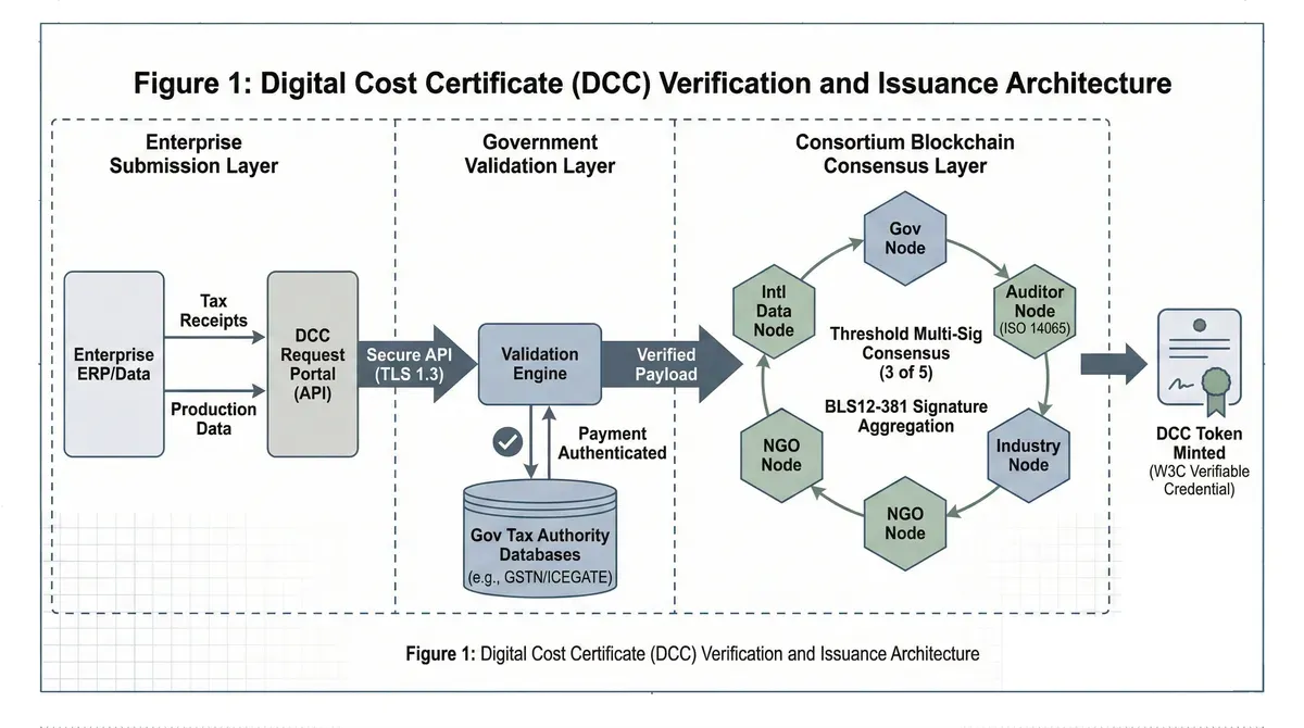 At its technical core, a Digital Cost Certificate functions as a W3C Verifiable Credential, containing cryptographically signed attestations about policy cost payment [12]. Each DCC encodes several data elements structured for interoperability and verification. The credential header specifies the issuing entity, typically a government agency with tax administration authority or delegated verification powers, along with issuance timestamp using ISO 8601 format and expiry date tied to fiscal reporting cycles. The payload contains the quantified carbon cost expressed in standardized units (€/tCO₂ equivalent), the specific policy instrument generating the cost (fuel excise duty, emissions trading allowance purchase, renewable energy certificate procurement), and the precise time period covered with start and end dates.
