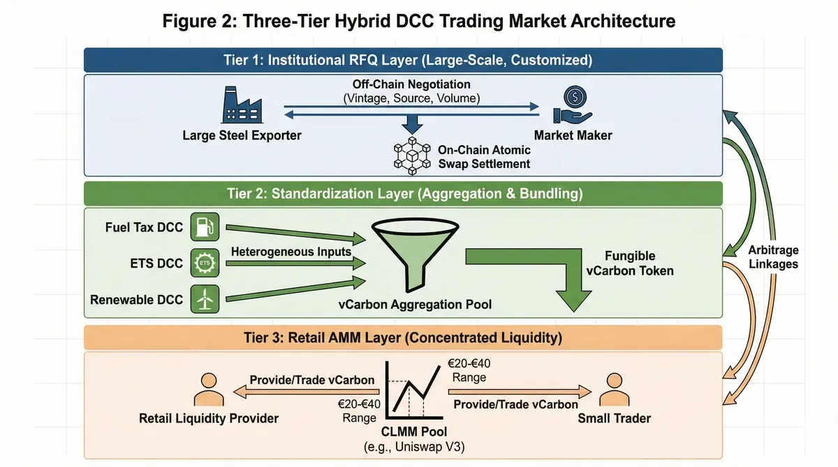 Retail participants trade standardized vCarbon on AMM pools without managing individual DCC attribute complexities. Sophisticated institutional players access granular DCC markets through RFQ when specific compliance requirements demand precise attribute matching. This layering partitions complexity along participant competence boundaries while maintaining overall market integration through arbitrage linkages between vCarbon and underlying DCC components.