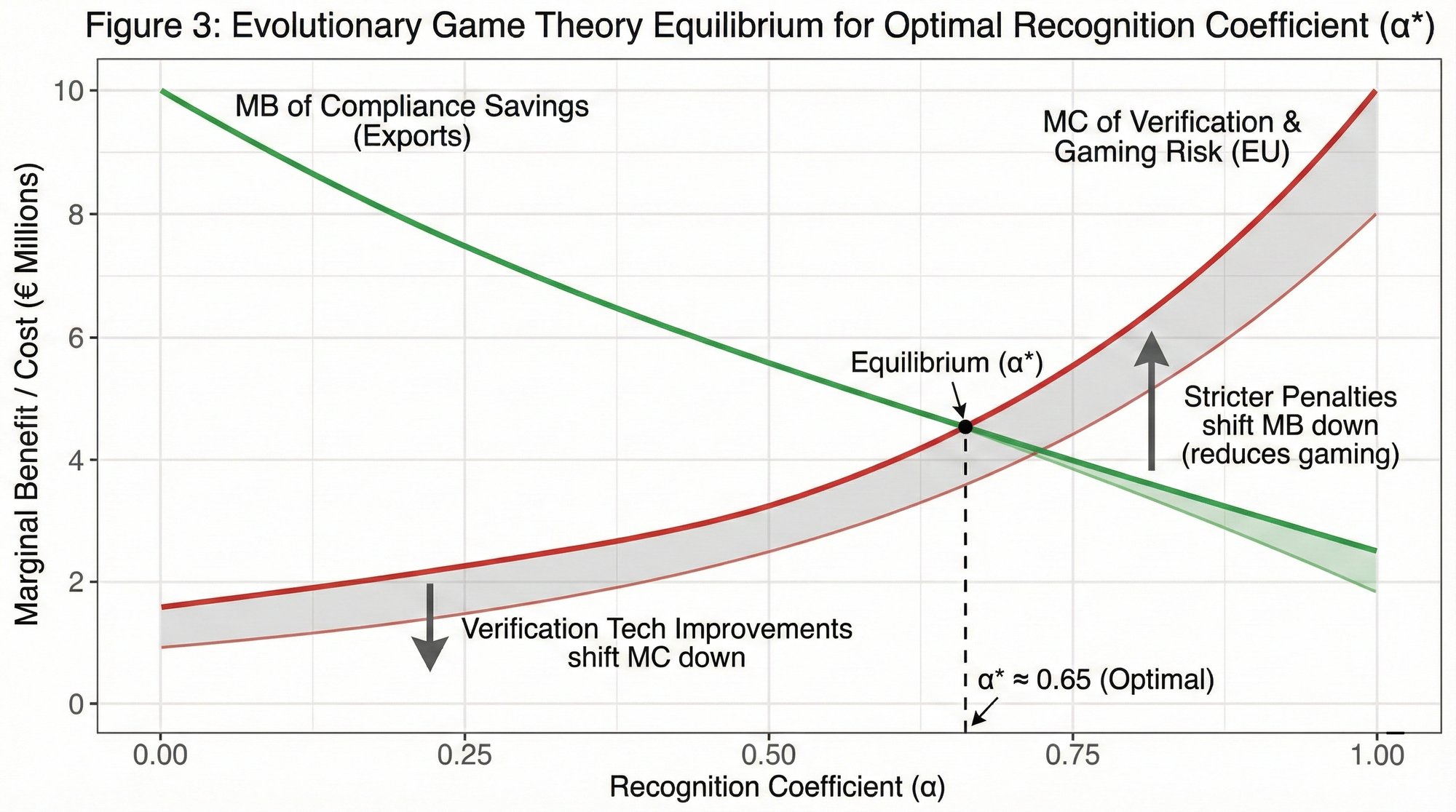 Optimal α* emerges where marginal benefits of increased recognition equal marginal costs from verification requirements and gaming vulnerabilities. Mathematically, this equilibrium satisfies: ∂(Expected Savings + Verification Cost + Gaming Damage) / ∂α = 0. Several structural factors shift this optimum. Verification technology improvements reduce required α levels to achieve target participation rates. If blockchain-based tax APIs slash verification costs by 80% relative to manual audit methods, the EU can confidently raise α from 0.25 to 0.40 while maintaining fraud risk below acceptable thresholds (perhaps 5% expected leakage) [38].
