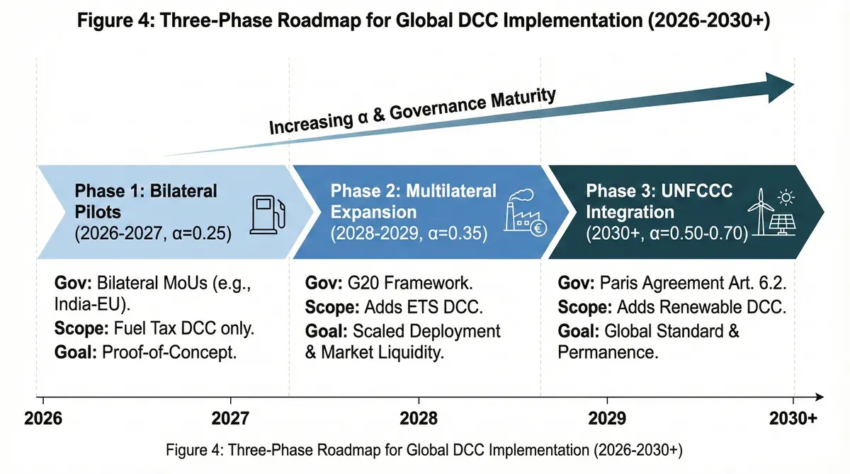 Phase 2 duration extends 18-24 months rather than fixed calendar period, allowing natural evolution pacing tied to institutional capacity rather than arbitrary deadlines. Transition to Phase 3 requires meeting objective criteria: cumulative DCC issuance exceeding 20 million ton-equivalent, fraud incident rates below 2% of volume, and successful WTO challenge resolution if any member initiates subsidy complaints. These gating mechanisms ensure Phase 2 stability before committing to deeper integration.