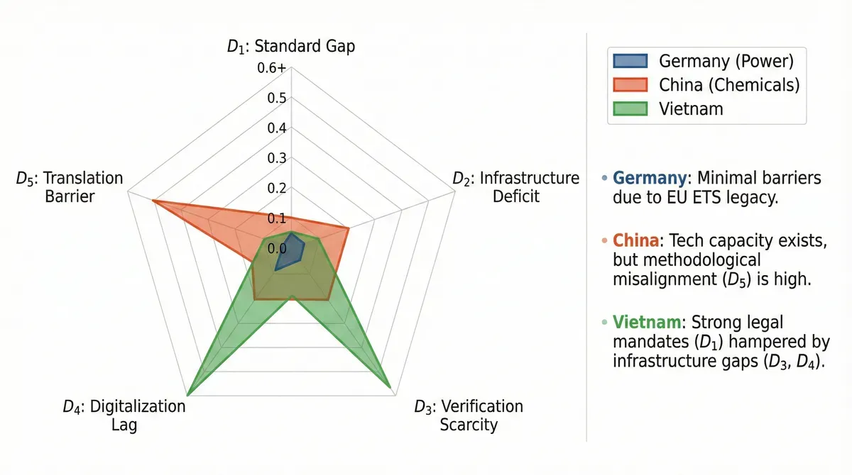 A point often overlooked: our findings engage debates about CBAM's compatibility with climate justice principles [5]. The translation barrier dimension (D5) quantifies how methodological misalignment imposes costs even when underlying data infrastructure exists. China's chemical sector exemplifies this—strong monitoring and verification capacity nonetheless yields moderate overall difficulty due to allocation rule divergences.