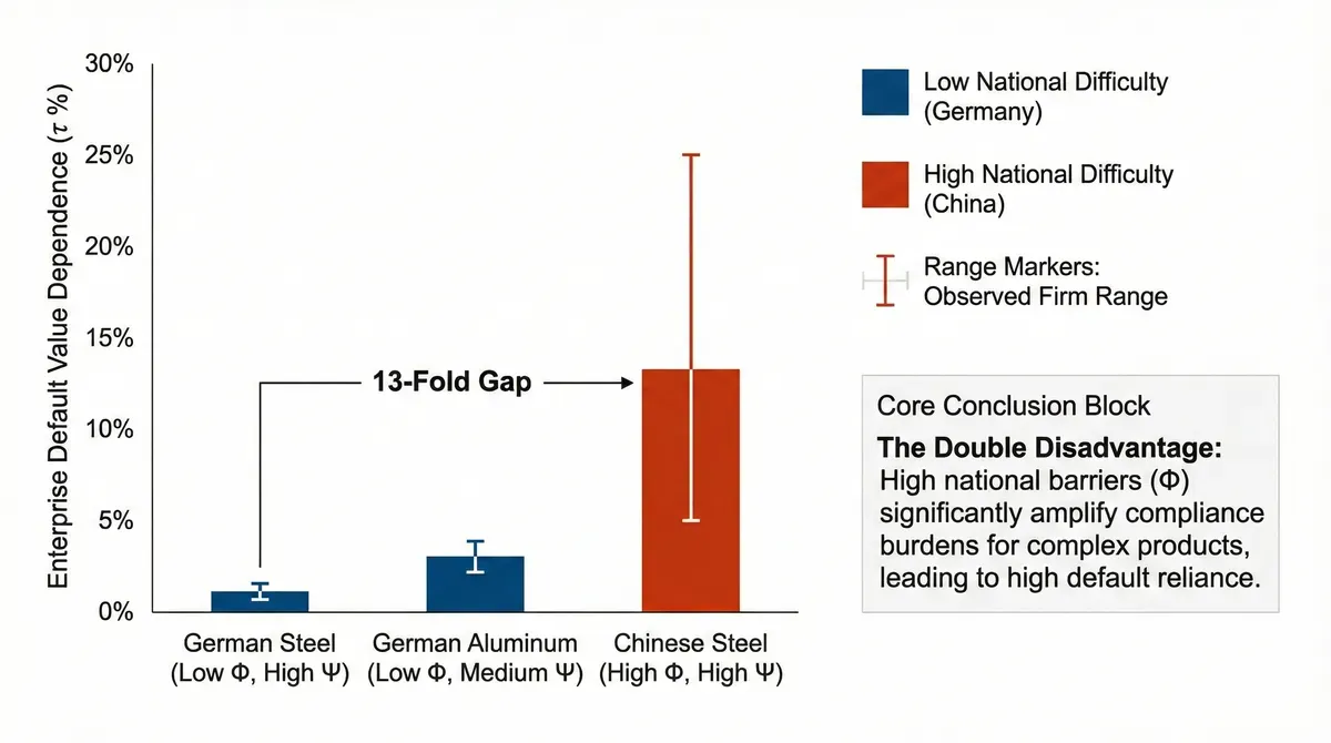 The interaction between national structural difficulty (Φ) and product technical complexity (Ψ) generates multiplicative burdens. This imposes double disadvantage on high-difficulty countries attempting sophisticated product accounting. Chinese steel producers, despite substantial firm-level platform investment, maintain default value dependence of 5-25% due to translation frictions between domestic standards and CBAM methodologies.