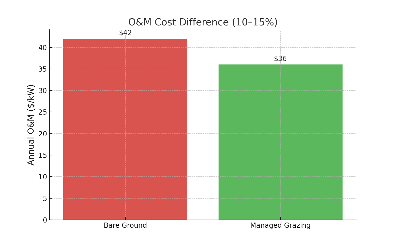 Insurance implications: A Nevada project documented insurance premium reduction from 0.8% to 0.5% of asset value—representing $600,000 annual savings on a $200 million installation. The insurer cited vegetation management and reduced dust as primary factors.
