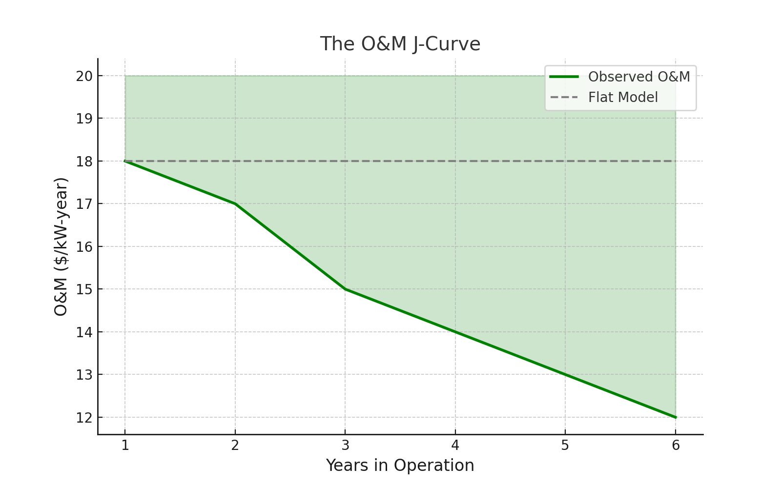 Lawrence Berkeley National Lab data from 89 U.S. utility-scale PV projects shows O&M expenditures declining from an average $18/kW-year in year 1 to $12/kW-year by year 5—a 33% reduction. This pattern challenges standard financial models that assume flat or escalating O&M costs.