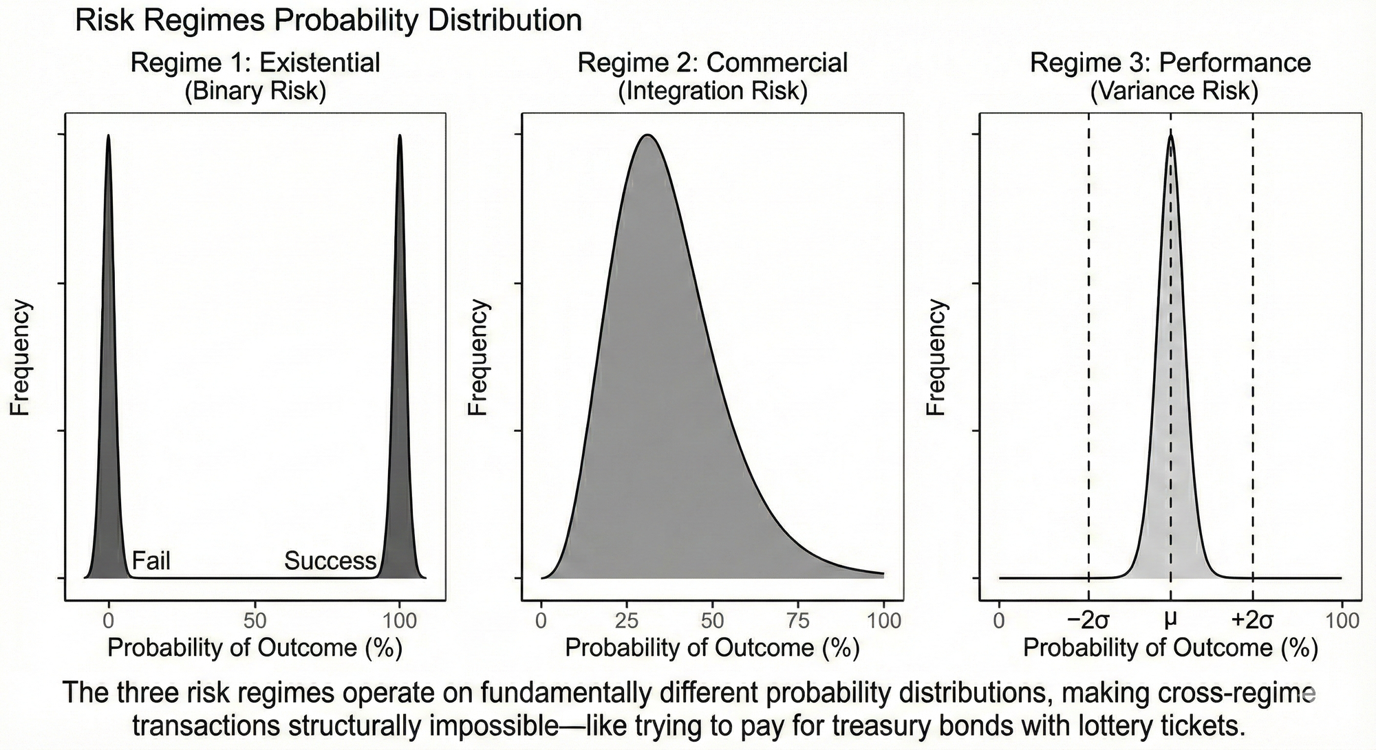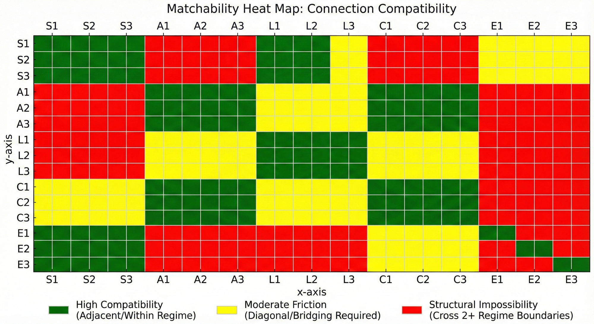 This classification reveals why certain connections persistently fail. When Regime 1 solutions attempt to sell to Regime 3 load, they're not just crossing functional boundaries—they're attempting to bridge incompatible risk languages. We use "structural impossibility" in a practical sense: cases where friction and misalignment make the effective probability of success negligibly small, typically below 5%.