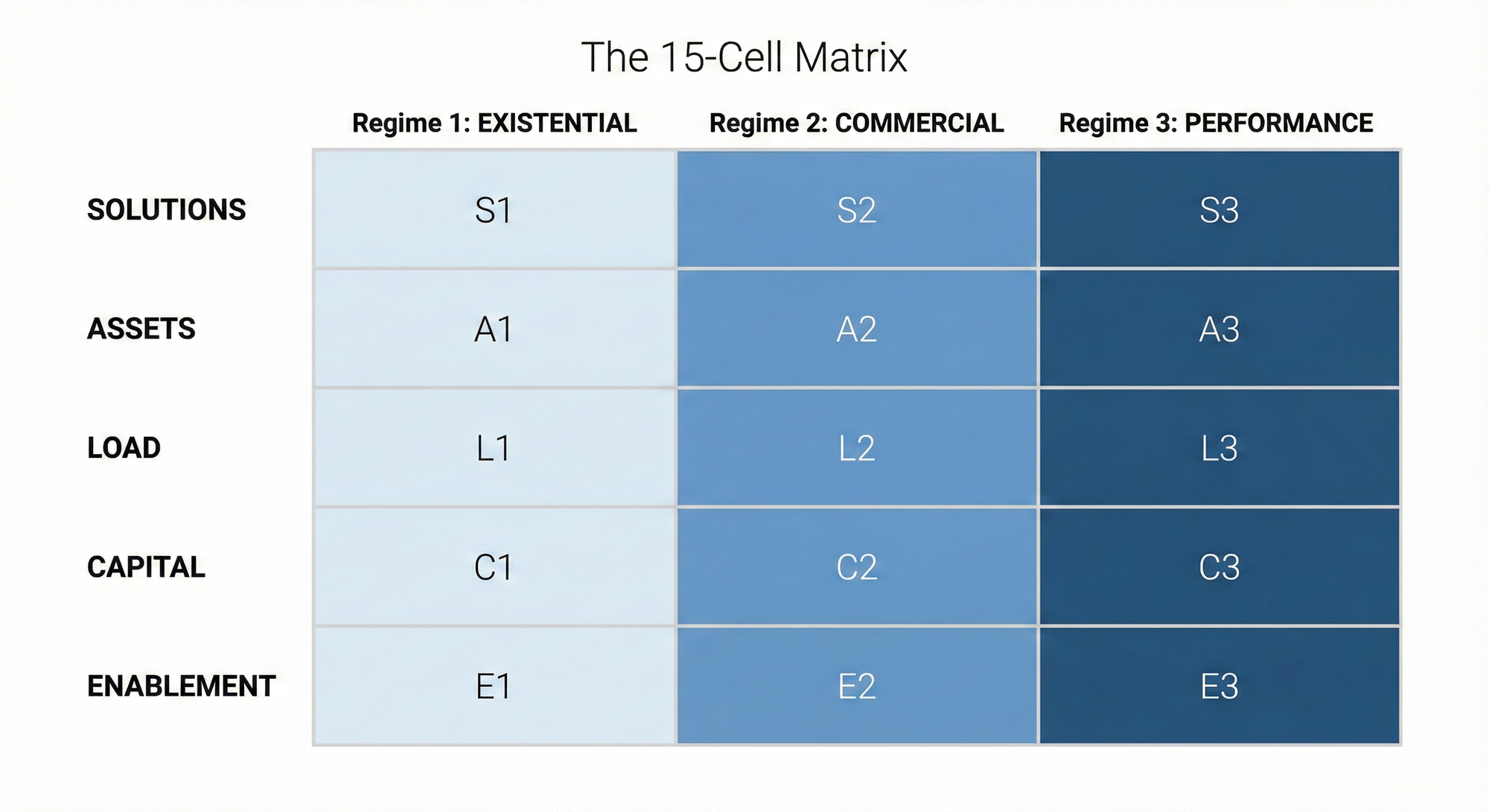 A concrete example illustrates the diagnostic power. A distributed energy resource company with innovative demand response technology identified large industrial customers as their primary market. Traditional analysis would examine product-market fit, competitive dynamics, and sales strategy. Structural analysis revealed a different reality: the company occupied position S1 (Existential/Solutions) while targeting L2 customers (Commercial/Load). The risk regime mismatch meant that regardless of product quality, the sales cycle would extend beyond the company's cash runway. The structural prescription was clear: first establish credibility with L1 early adopters, use those proof points to attract C2 growth capital, then approach L2 customers from a position of commercial validation. This isn't just sequencing—it's structural necessity.